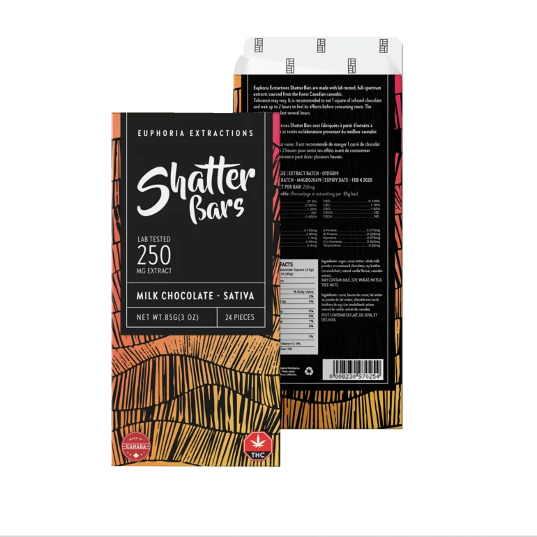 Euphoria Extractions Milk Chocolate Shatterbars are the perfect solution for your edible needs. With 24 squares of the highest quality Belgian chocolate, these bars are easy to manage and contain a potent 250mg of Lab Tested Full Spectrum Extract sourced from the finest cannabis available. Euphoria Shatterbars are guaranteed to provide total satisfaction.